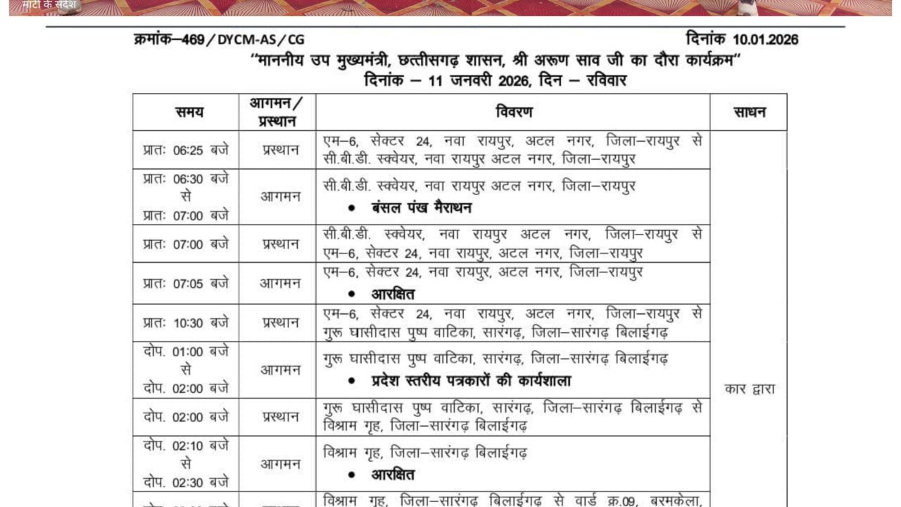 उप मुख्यमंत्री के सारंगढ़–बरमकेला दौरे का प्रोटोकॉल जारी, प्रदेश स्तरीय पत्रकार कार्यशाला व अटल परिसर लोकार्पण को लेकर उत्साह चरम...