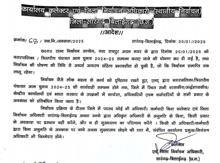 जिला निर्वाचन अधिकारी धर्मेश कुमार साहू ने सभी अवकाश पर लगाया प्रतिबंध बिना अनुमति अवकाश और मुख्यालय छोड़ने पर होगी...