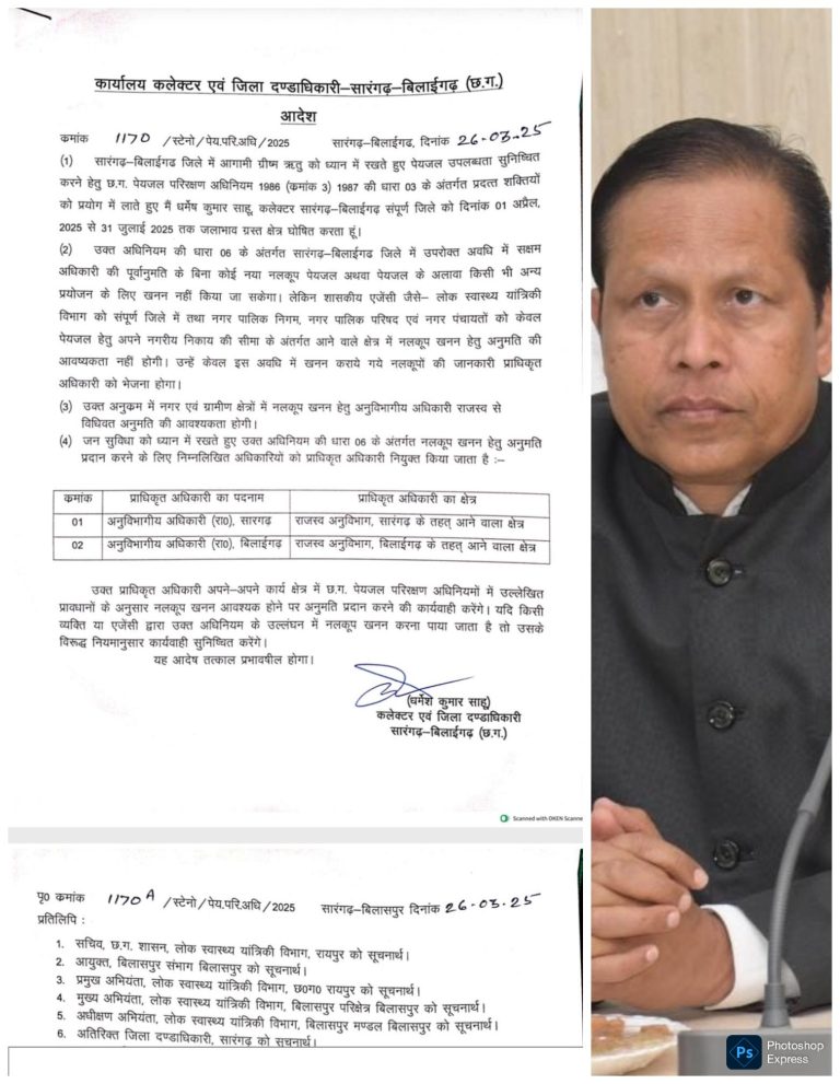 बिना अनुमति बोर खनन 1 अप्रैल से 31 जुलाई तक प्रतिबंधितकलेक्टर एवं जिला दंडाधिकारी धर्मेश कुमार साहू ने जारी किया...