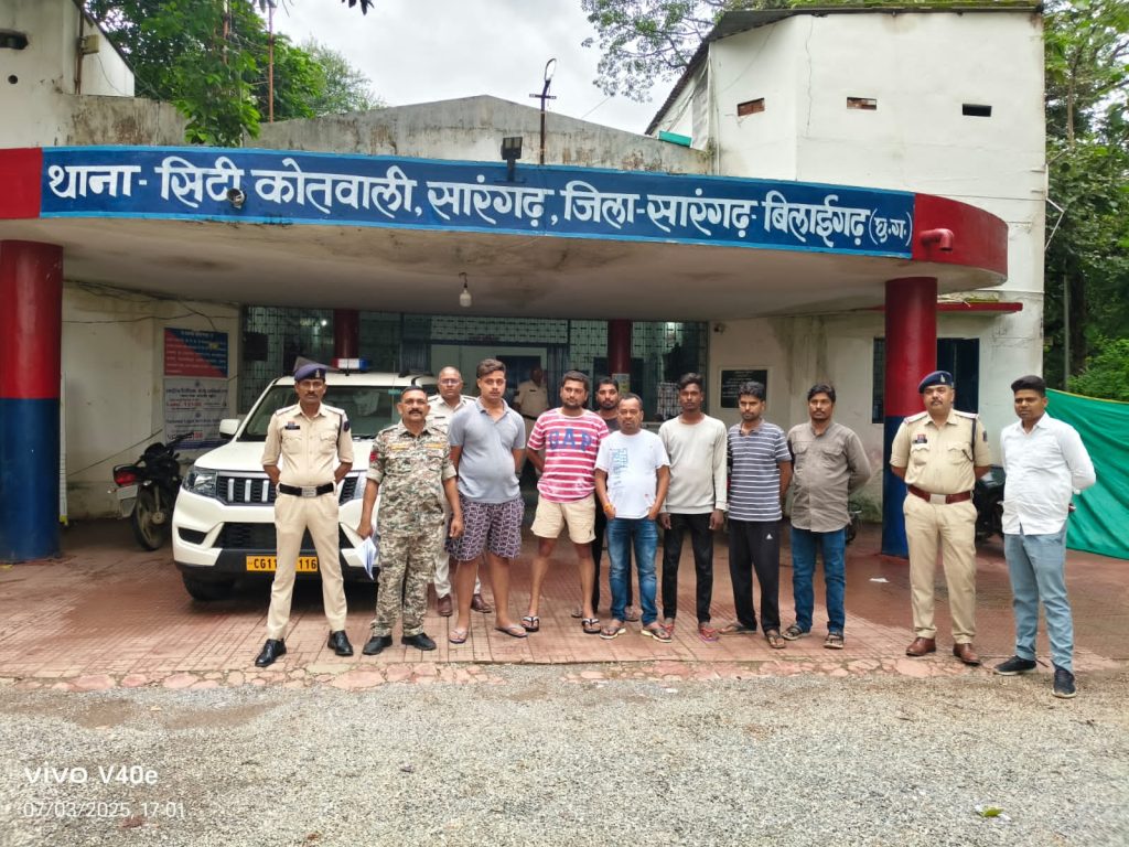 अप0क्रं0- 318/25 धारा:- 109(1),310(2) बीएनएस:- प्रकरण में प्रार्थी अमितेश केशरवानी थाना उपस्थित आकर एक लिखित आवेदन पेश किया की इसका छोटा भाई मयूरेश केशरवानी उर्फ बंटी घटना दिनांक-02.07.2025 के लगभग 09.00 बजे रात्रि में उसके मार्बल दुकान रायगढ़ रोड के पास बैठा था कि उसी समय 10-15 लोगो के द्वारा उसके उपर जान लेवा हमला कर मारपीट कर चोंट पहुंचाकर उसके साथ लूट किये है उक्त आवेदन पर आरोपीगणों के विरुद्ध अपराध पंजीबद्ध कर विवेचना मे लिया गया है। विवेचना दौरान प्रकरण के आरोपियों के पता तलाश हेतु जिला सारंगढ़ बिलाईगढ़ पुलिस कि सयुंक्त टीम द्वारा प्रकरण के फरार आरोपियों का पता तलाश कर उन्हें घेरा बंदी कर पकड़ा गया। प्रकरण के आरोपीगण (1) आशीष कुमार पटेल पिता हेमलाल पटेल उम्र थाना सारंगढ़ जिला सारंगढ़ बिलाईगढ़ (छ०ग०) 19 वर्ष साकिन गुड़ीहारी (2) धीरज कहार पिता स्व०राजेश कहार उम्र 35 वर्ष साकिन रेंजरपारा सारंगढ़ थाना सारंगढ़ जिला सारंगढ़ बिलाईगढ़ (छ०ग०) (3) अजय बंजारे पिता कन्हैया लाल बंजारे उम्र 40 वर्ष साकिन रेंजरपारा सारंगढ़ थाना सारंगढ़ जिला सारंगढ़ बिलाईगढ़ (छ०ग०) (4) आयुष दुबे पिता मनोज दुबे उम्र 19 वर्ष साकिन बड़े मठपारा सारंगढ़ थाना सारंगढ़ जिला सारंगढ़ बिलाईगढ़ (छ०रा०) (5) चारु शर्मा पिता गोपाल शर्मा उम्र 28 वर्ष साकिन फुलझरियापारा सारंगढ़ थाना सारंगढ़ जिला सारंगढ़ बिलाईगढ़ (छ०ग०) (6) मंधावा मिरी पिता तीजराम मिरी उम्र 31 वर्ष साकिन रेजरपारा सारंगढ़ थाना सारंगढ़ जिला सारंगढ़ बिलाईगढ़ (छ०ग०) (7) संजय मिरी पिता रामेश्वर मिरी उम्र 33 वर्ष साकिन रेंजरपारा सारंगढ़ थाना सारंगढ़ जिला सारंगढ़ बिलाईगढ़ (छ०ग०) को विधिवत् दिनांक- 03.07.2025 बजे गिरफ्तार कर न्यायिक रिमाण्ड पर भेजा गया है। प्रकरण के अन्य फरार आरोपियों का पता तलाश किया जा रहा है