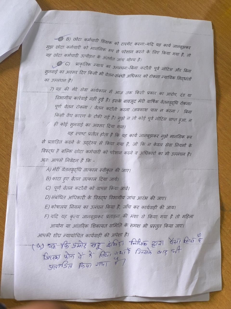 9) सेवा कार्यकाल में आज तक किसी प्रकार का आरोप, दंड या विभागीय कार्रवाई नहीं हुई है। इसके बावजूद मेरी वार्षिक वेतनवृद्धि रोकना/ पूर्ण वेतन रोकना / वेतन कटौती करना /अवकाश पास न करना / बिना किसी वैध कारण के रोकी गई है। कोई पूर्व नोटिस प्राप्त हुआ, न ही कोई सुनवाई का अवसर दिया गया।