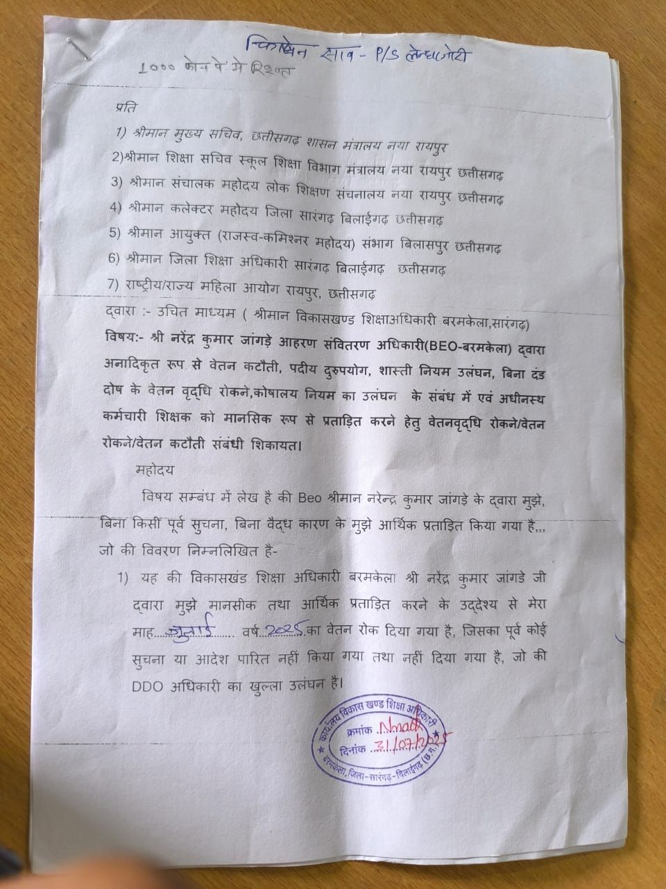 1) यह की विकासखंड शिक्षा अधिकारी बरमकेला श्री नरेंद्र कुमार जांगड़े जी द्वारा मुझे मानसी का आर्थिक प्रताड़ित करने के उद्देश्य कार्यवाही किया गया है जिसका पूर्व कोई सुचना या आदेश पारित नहीं किया गया तथा नहीं दिया गया है, जो की DDO अधिकारी का खुल्ला उलंघन है।