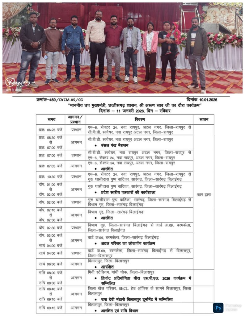 उप मुख्यमंत्री के सारंगढ़–बरमकेला दौरे का प्रोटोकॉल जारी, प्रदेश स्तरीय पत्रकार कार्यशाला व अटल परिसर लोकार्पण को लेकर उत्साह चरम पर