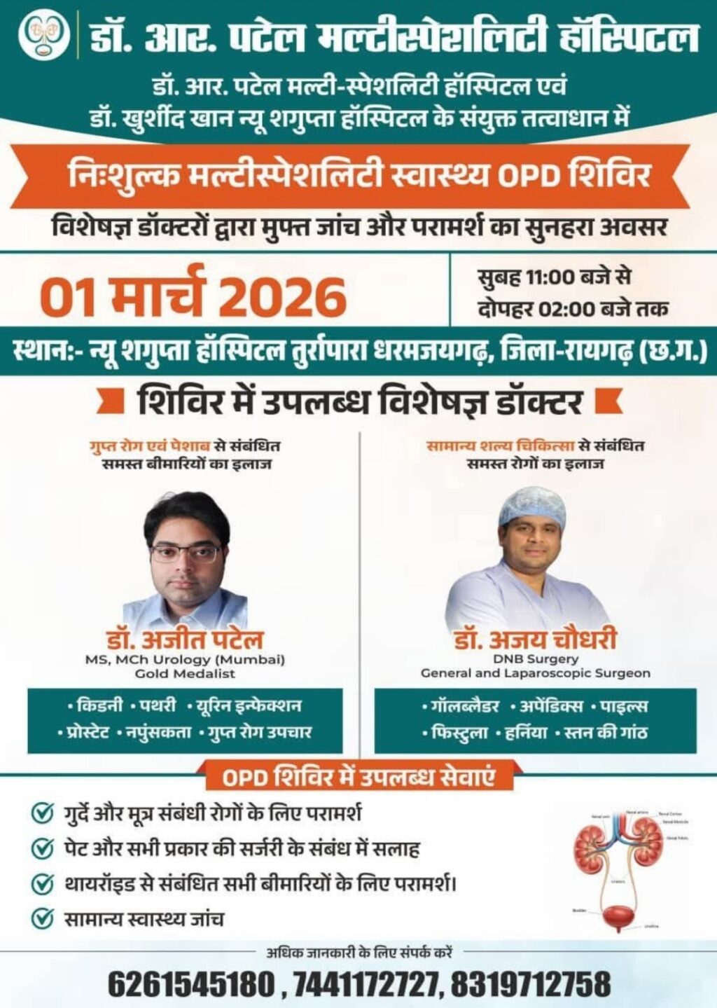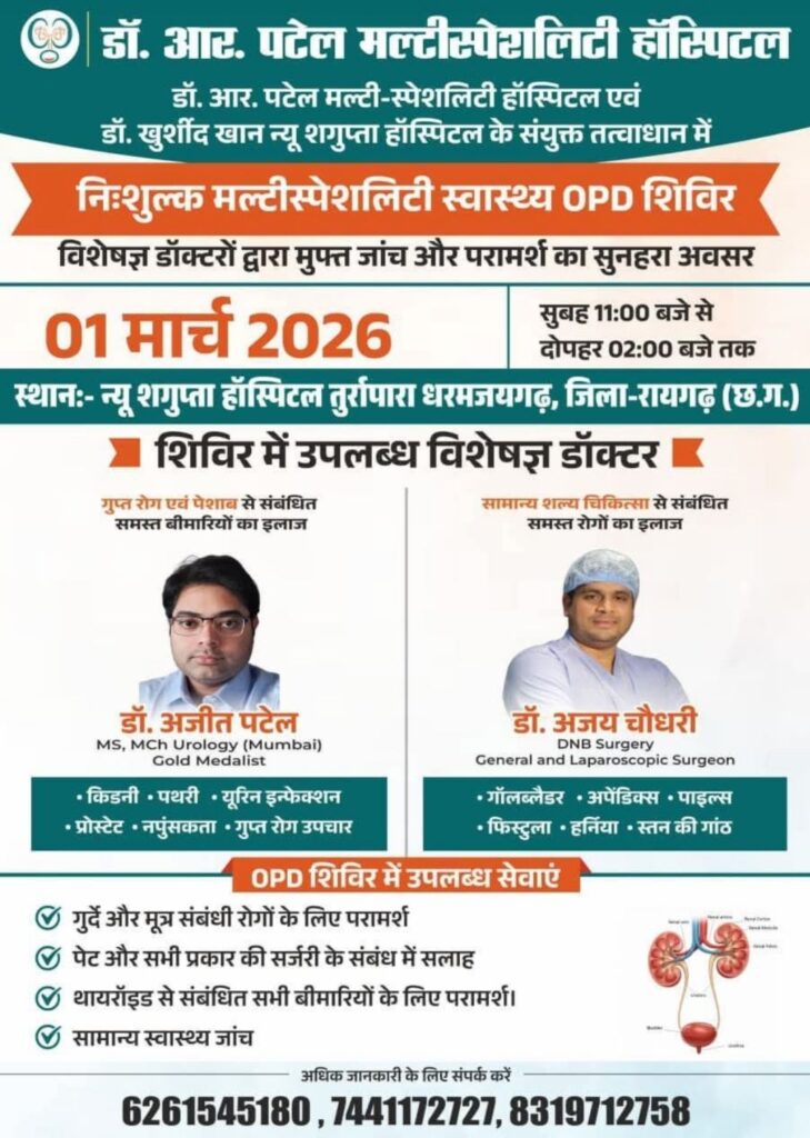 *धरमजयगढ़*(रायगढ़)। क्षेत्र के ग्रामीणों के लिए एक सुनहरा अवसर लेकर 1 मार्च 2026, रविवार को न्यू शगुफ्ता हॉस्पिटल, तुर्रापारा धरमजयगढ़ में निःशुल्क मल्टीस्पेशलिटी स्वास्थ्य OPD शिविर का आयोजन किया जा रहा है। यह शिविर डॉ. आर. पटेल मल्टीस्पेशलिटी हॉस्पिटल एवं डॉ.अख्तरी खुर्शीद खान न्यू शगुफ्ता हॉस्पिटल के संयुक्त तत्वावधान में आयोजित होगा।शिविर सुबह 11:00 बजे से दोपहर 2:00 बजे तक आयोजित रहेगा, जिसमें विशेषज्ञ डॉक्टरों द्वारा मरीजों की निःशुल्क जांच एवं परामर्श दिया जाएगा।इस स्वास्थ्य शिविर में मुंबई से विशेषज्ञता हासिल ख्याति प्राप्त यूरोलॉजिस्ट डॉ. अजीत पटेल (MS, MCh Urology – Gold Medalist) द्वारा किडनी, पथरी, यूरिन इंफेक्शन, प्रोस्टेट, नपुंसकता एवं अन्य गुप्त रोगों से संबंधित बीमारियों की जांच व परामर्श दिया जाएगा।साथ ही डॉ. अजय चौधरी (DNB Surgery) द्वारा सामान्य एवं लेप्रोस्कोपिक सर्जरी से जुड़ी समस्याओं जैसे गॉलब्लेडर, अपेंडिक्स, पाइल्स, फिस्टुला, हर्निया एवं स्तन गांठ आदि रोगों के संबंध में सलाह प्रदान की जाएगी,शिविर में गुर्दा एवं मूत्र रोग, पेट संबंधी समस्याएं, थायराइड हाइड्रोसिल तथा सामान्य स्वास्थ्य जांच की सुविधा भी उपलब्ध रहेगी,अस्पताल प्रबंधन ने क्षेत्र के सभी ग्रामीणों, महिलाओं एवं बुजुर्गों से अपील की है कि इस निःशुल्क स्वास्थ्य शिविर का अधिक से अधिक लाभ उठाएं और समय पर जांच कराकर गंभीर बीमारियों से बचाव करें,अधिक जानकारी और अग्रिम पंजीकरण के लिए इस 6261545180,7441172727, 8319712758 नंबर पर संपर्क करे।