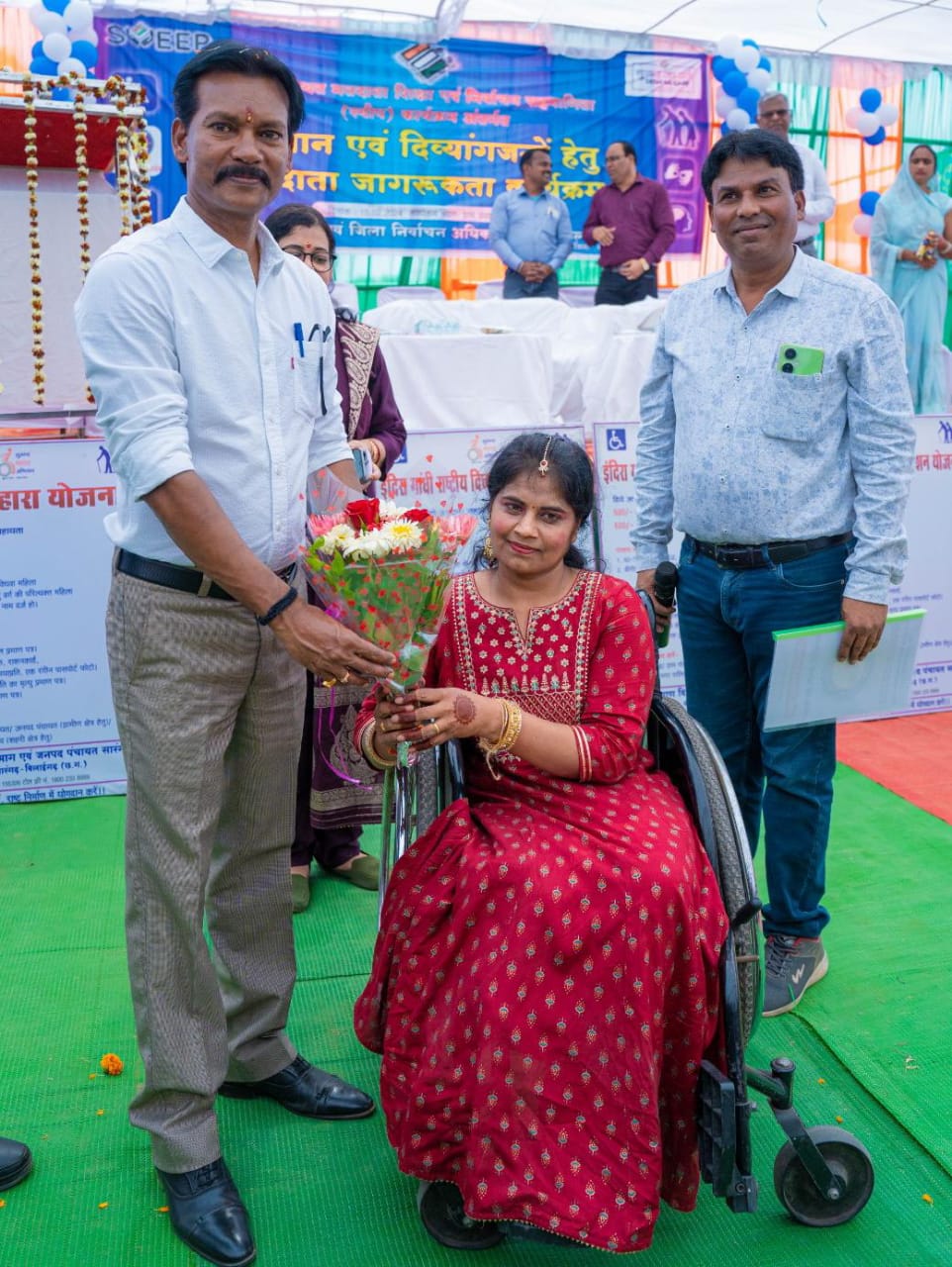 सारंगढ़ बिलाईगढ़ 16 फरवरी 2024/ कलेक्टर श्री के एल चौहान के मुख्य आतिथ्य में सारंगढ़ विकासखंड के ग्राम पंचायत रेडा में मतदाता जागरूकता अभियान अंतर्गत दिव्यांग एवं सियान सम्मान समारोह आयोजित किया गया। कलेक्टर श्री चौहान ने दिव्यांग चंचला पटेल को सम्मानित किया। दिव्यांग प्रशिक्षक, एक पैर से दिव्यांग होने के बावजूद डेढ़ पैर से नाचने वाली नर्तक चंचला पटेल भी इस मतदाता जागरूकता कार्यक्रम में शामिल होकर दो गानों में नृत्य की। साथ ही दो मानसिक दिव्यांग को भी इस नृत्य में शामिल कर उनको भी किसी समारोह में नृत्य प्रदर्शन करने का हौसला अफजाई की। उनके ट्राई सायकल पर आना, गाने के बढ़ते क्रम में जमीन पर गिरकर नृत्य करना, फिर एक पैर से खड़ी होकर नृत्य करना। दर्शको के सामने दिव्यांगता को भूलकर अपने नृत्य में मग्न होकर कार्यक्रम सामान्य ढंग से पूरा कर अपनी बहादूर दिव्यांग श्रेणी के कलाकार का परिचय चंचला पटेल ने सभी दर्शकों को दिया। उनके प्रदर्शन को देखकर कलेक्टर श्री चौहान ने मंच से उतरकर उनको गुलदश्ता देकर नाम, शिक्षा की जानकारी प्राप्त किए। एकल नृत्य के बाद अपने दो सहयोगी के साथ विद्वान रावण द्वारा रचित भगवान श्री शिव के तांडव स्तोत्र पर चंचला ने अपना प्रदर्शन की। उल्लेखनीय है कि बचपन में कक्षा दसवीं के परीक्षा देते जाते समय दुर्घटना में चंचला दिव्यांग हुई। दिव्यांगो की सेवा को लक्ष्य निर्धारित करने वाली इस चंचला पटेल ने स्पेशल बीएड की है और वे जिंदल फाउंडेशन अंतर्गत “आशा द होप” संस्था में प्रशिक्षक है। इसी प्रकार बरमकेला के किसी संस्था की वह सदस्य भी है। अब तक वे सैकड़ों दिव्यांग को प्रशिक्षण दे चुकी है। विशेष आमंत्रण पर वह दिव्यांग सम्मान और मतदाता जागरूकता अभियान में शामिल हुई।