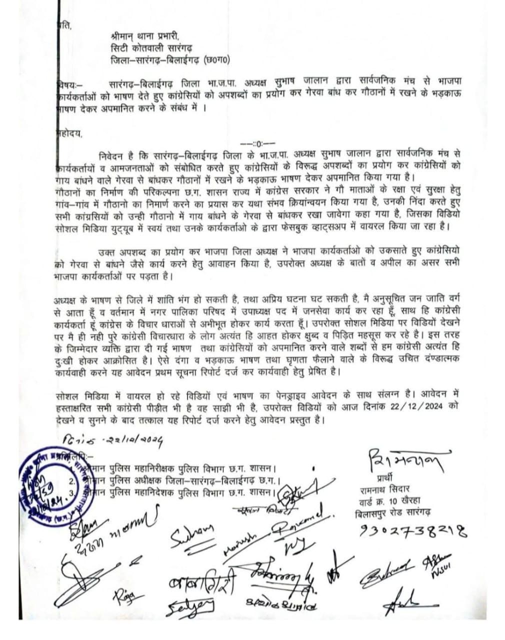 भाजपा जिलाध्यक्ष के भाषण से जिले में शांति भंग हो सकती है, तथा अप्रिय घटना घट सकती है, मै अनुसूचित जन जाति वर्ग से आता हूँ व वर्तमान में नगर पालिका परिषद में उपाध्यक्ष पद में जनसेवा कार्य कर रहा हूँ,साथ ही कांग्रेसी कार्यकर्ता हूं कांग्रेस के विचार धाराओं से अभीभूत होकर कार्य करता हूँ। उपरोक्त सोशल मिडिया पर विडियों देखने पर मैं ही नही पुरे कांग्रेसी विचारधारा के लोग अत्यंत हि आहत होकर क्षुब्द व पीड़ित महसूस कर रहे है। इस तरह के जिम्मेदार व्यक्ति द्वारा दी गई भाषण व कांग्रेसियों को अपमानित करने वाले शब्दों से हम कांग्रेसी अत्यंत हि दुःखी होकर आक्रोसित है। ऐसे दंगा व भड़काऊ भाषण तथा घृणता फैलाने वाले के विरूद्ध उचित दंण्डात्मक कार्यवाही करने यह आवेदन प्रथम सूचना रिपोर्ट दर्ज कर कार्यवाही हेतु प्रेषित है ।सोशल मिडिया में वायरल हो रहे विडियों एवं भाषण का पेनड्राइव आवेदन के साथ संलग्न है। आवेदन में हस्ताक्षरित सभी कांग्रेसी पीडीत भी है वह साझी भी है, उपरोक्त विडियों को आज दिनांक 22/12/2024 को देखने व सुनने के बाद तत्काल यह रिपोर्ट दर्ज करने हेतु आवेदन प्रस्तुत है।