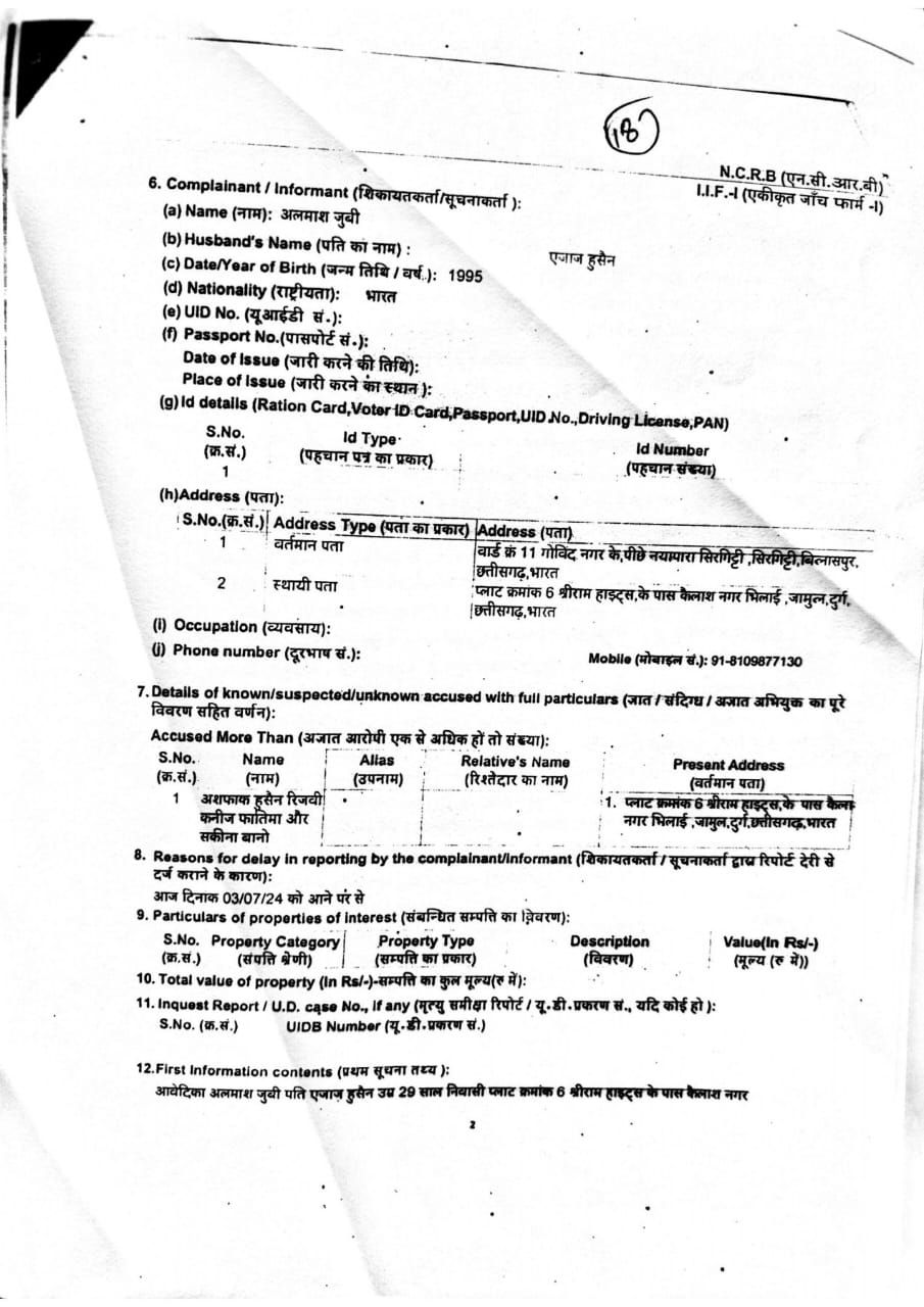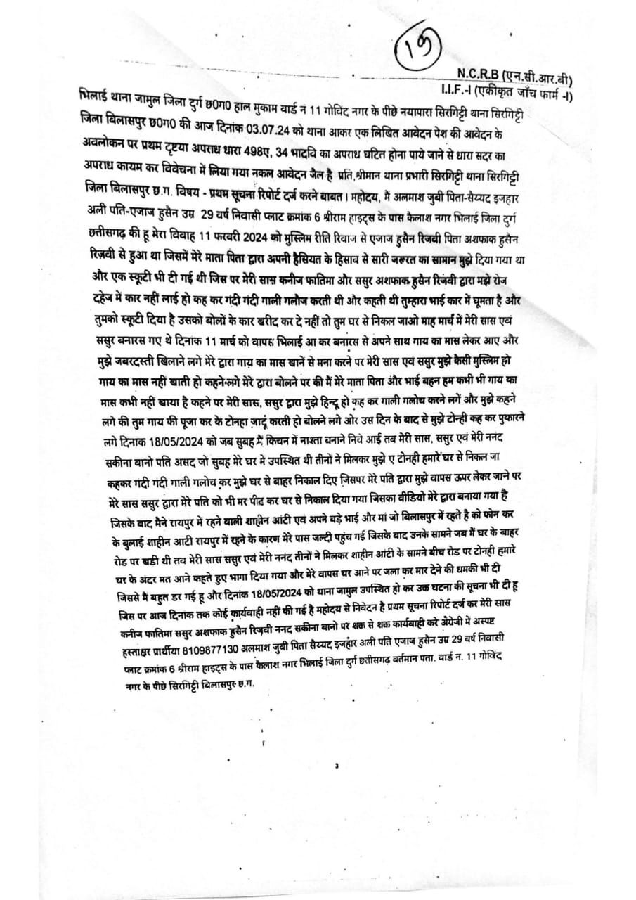जिला दुर्ग – भिलाई थाना जामुल जिला दुर्ग छ0ग0 हाल मुकाम बार्ड नं 11 गोविंद नगर के पीछे नयापारा सिरगिट्टी याना सिरगिट्टी जिला बिलासपुर छ0ग0 की आज दिनांक 03.07.24 को थाना आकर एक लिखित आवेदन पेश की आवेदन के अवलोकन पर प्रथम दृष्टया अपराध धारा 498ए, 34 भादवि का अपराध घटित होना पाये जाने से धारा सदर का अपराध कायम कर विवेचना में लिया गया नकल आवेदन जैल है प्रति, श्रीमान थाना प्रभारी सिरगिट्टी थाना सिरगिट्टी जिला बिलासपुर छ.ग. विषय प्रथम सूचना रिपोर्ट दर्ज करने बाबत। महोदय, मैं अलमाश जुबी पिता-सैय्यद इजहार अली पति-एजाज हुसैन उम्र 29 वर्ष निवासी प्लाट क्रमांक 6 श्रीराम हाइट्स के पास कैलाश नगर भिलाई जिला दुर्ग छत्तीसगढ़ की हू मेरा विवाह 11 फरवरी 2024 को मुस्लिम रीति रिवाज से एजाज हुसैन रिजबी पिता अशफाक हुसेन रिजवी से हुआ था जिसमें मेरे माता पिता द्वारा अपनी हैसियत के हिसाब से सारी जरूरत का सामान मुझे दिया गया था और एक स्कूटी भी दी गई थी जिस पर मेरी सास कनीज फातिमा और ससुर अशफाक हुसैन रिजवी द्वारा मझे रोज दहेज में कार नहीं लाई हो कह कर गंदी गंदी गाली गलौज करती थी और कहती थी तुम्हारा भाई कार में घूमता है और तुमको स्कूटी दिया है उसको बोलों के कार खरीद कर दे नहीं तो तुम घर से निकल जाओ माह मार्च में मेरी सास एवं ससुर बनारस गए थे दिनाक 11 मार्च को वापस भिलाई आकर बनारस से अपने साथ गाय का मास लेकर आए और मुझे जबरदस्ती खिलाने लगे मेरे द्वारा गाय का मास खाने से मना करने पर मेरी सास एवं ससुर मुझे कैसी मुस्लिम हो गाय का मास नहीं खाती हो कहने लगे मेरे द्वारा बोलने पर की मैं मेरे माता पिता और भाई बहन हम कभी भी गाय का मास कभी नहीं खाये है कहने पर मेरी सास, ससुर द्वारा मुझे हिन्दू हो कह कर गाली गलोच करने लगें और मुझे कहने लगे की तुम गाय की पूजा कर के टोनहा जादूं करती हो बोलने लगे ओर उस दिन के बाद से मुझे टोन्ही कह कर पुकारने लगे दिनाक 18/05/2024 को जब सुबह में किचन में नास्ता बनाने निचे आई तब मेरी सास, ससुर एवं मेरी ननंद सकीना बानो पति असद जो सुबह मेरे घर में उपस्थित थी तीनों ने मिलकर मुझे ए टोनही हमारे घर से निकल जा कहकर गंदी गंदी गाली गलोच कर मुझे घर से बाहर निकाल दिए जिसपर मेरे पति द्वारा मुझे वापस ऊपर लेकर जाने पर मेरे सास ससुर द्वारा मेरे पति को भी मार पीठ कर घर से निकाल दिया गया जिसका वीडियो मेरे द्वारा बनाया गया है जिसके बाद मैने रायपुर में रहने वाली थानेन आंटी एवं अपने बड़े भाई और मां जो बिलासपुर में रहते है को फोन कर के बुलाई शाहीन आंटी रायपुर में रहने के कारण मेरे पास जल्दी पहुंच गई जिसके बाद उनके सामने जब मैं घर के बाहर रोड पर बैठी थी तब मेरी सास ससुर एवं मेरी ननंद तीनों ने मिलकर शाहीन आंटी के सामने बीच रोड पर टोनही हमारे घर के अंदर मत आने