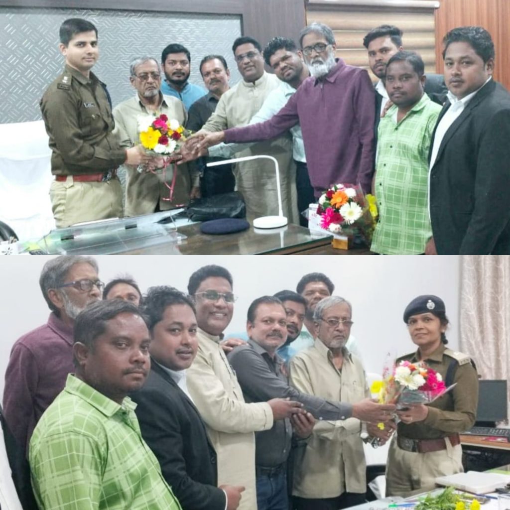 सारंगढ़ बिलाईगढ़ न्यूज़/ सारंगढ़ बिलाईगढ़ जिला श्रमजीवी पत्रकार संघ के पत्रकारों ने जिले के पुलिस कप्तान पुष्कर शर्मा एवं अतिरिक्त पुलिस अधीक्षक श्रीमती निमिषा पांडे से सौजन्य भेंट कर गुलदस्ता देकर नव वर्ष की शुभकामनाएं दी। संघ के प्रदेश उपाध्यक्ष अब्बास अली सैफी, जिला अध्यक्ष गोल्डी नायक, ब्लॉक अध्यक्ष गोपेश द्विवेदी के साथ संघ के पदाधिकारी ने जिला पुलिस प्रशासन को शहर की यातायात व्यवस्था, जिला बनने के बाद शहर के मुख्य मार्गो चौक चौराहो और बाजारों में बढ़ती भीड़ को देखते हुए सुव्यवस्थित आवागमन व्यवस्था व पासपोर्ट निर्माण में हो रही विलंबता को लेकर जिले के अधिकारियों का ध्यान आकृष्ट करते हुए ज्ञापन सौंपा।
