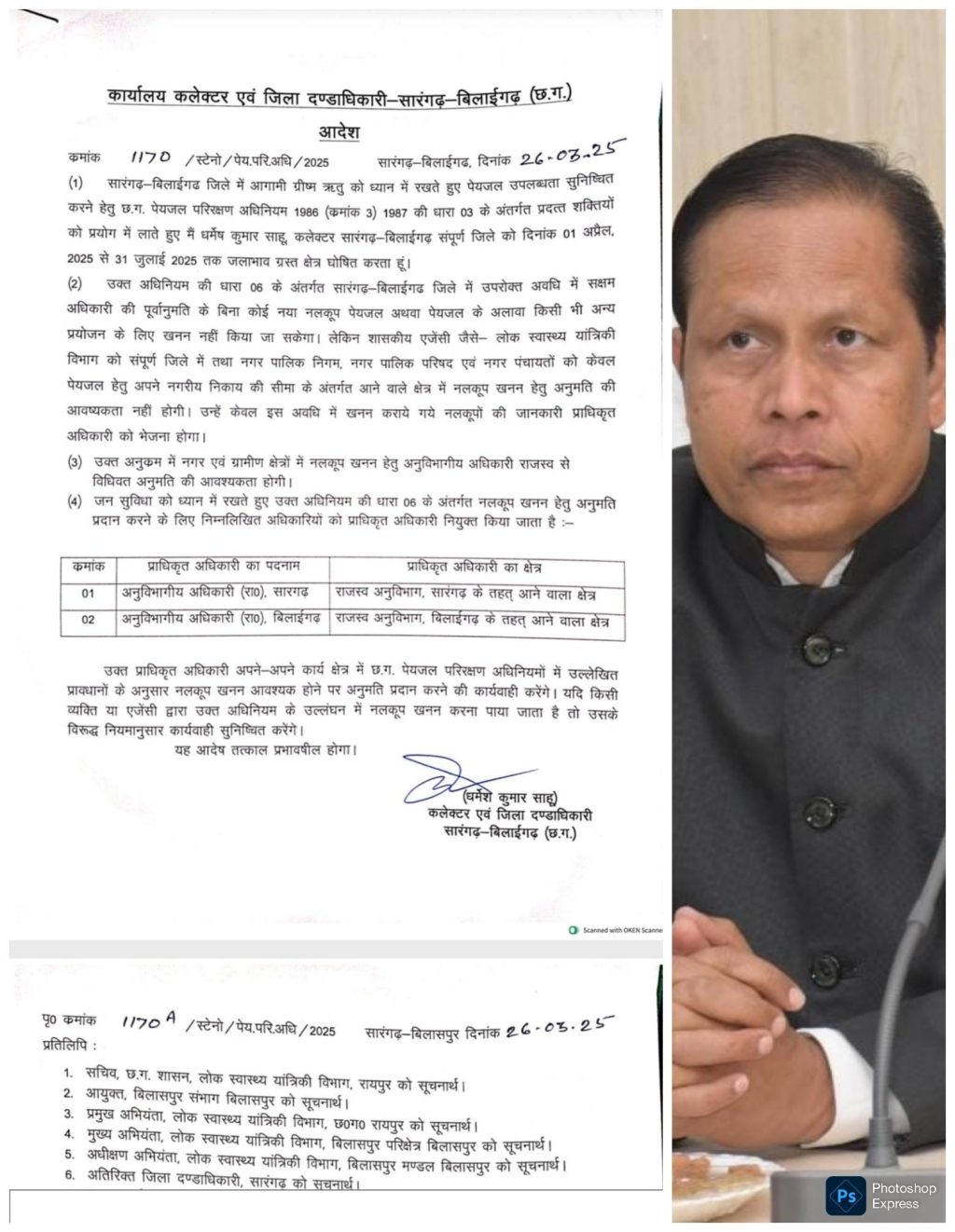 जन सुविधा को ध्यान में रखते हुए अधिनियम की धारा 06 के अंतर्गत नलकूप खनन हेतु अनुमति प्रदान करने के लिए राजस्व अनुविभाग सारंगढ़ के तहत् आने वाला क्षेत्र के लिए